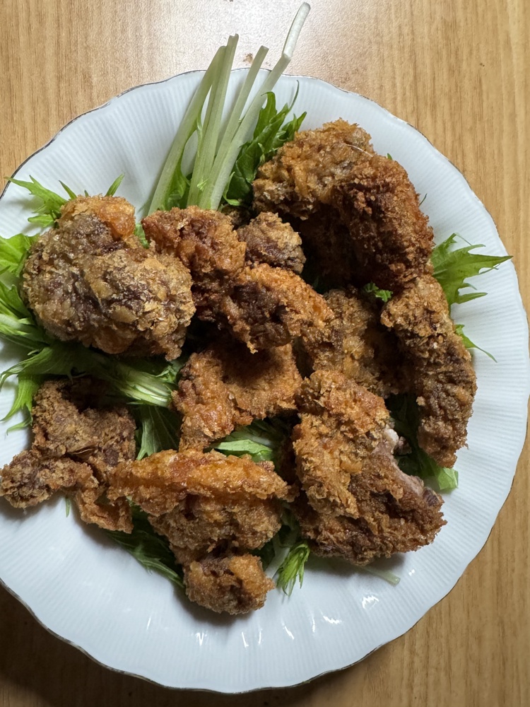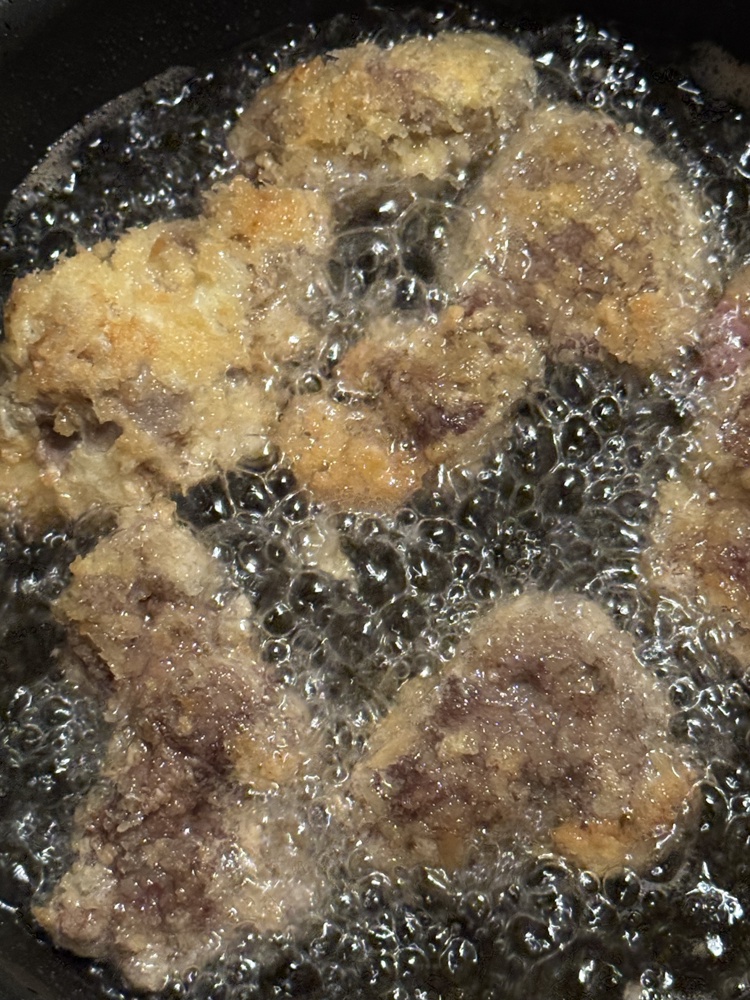 肉を解凍してちょっと薄めに切り薄力粉と卵とパン粉をつけて油で揚げればいいだけ